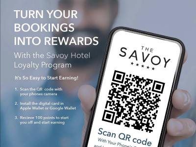 Double Points Exclusive for February, Unlock immediate rewards when you sign up for The Savoy Collection Loyalty Programme. New members receive a 10% discount on our available Bed & Breakfast rate and enjoy double loyalty points for all stays completed in February 2026. This offer is available to all guests who complete their Loyalty sign up before arrival. How to Join: • Scan the QR code • Enter your email to receive your 4 digit activation code • Book directly to apply your discount and start earning points